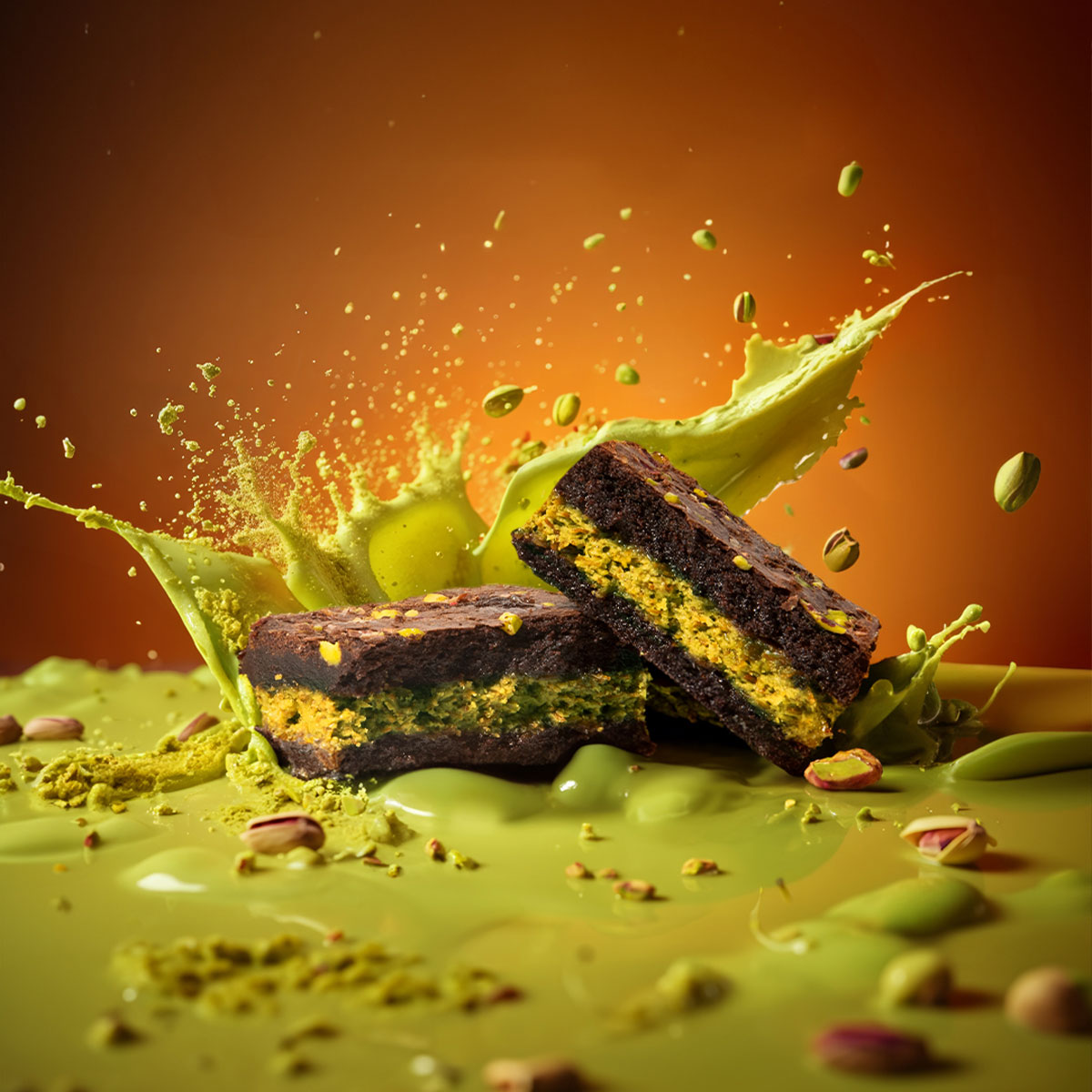 Dubai Chocolate Brownie: Dark chocolate, sugar, pasteurized egg, hazelnut oil, wheat flour, cocoa, pistachio paste, crushed pistachios, shredded phyllo dough, tahini